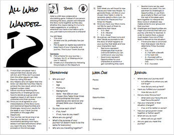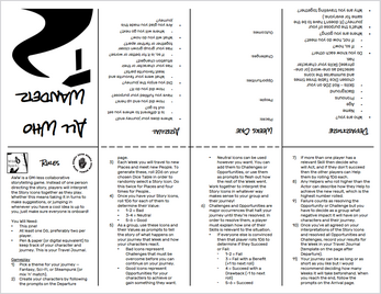 All Who Wander is a GM-less collaborative storytelling game for 2+ players. Decide together where you're going and what happens along the way, using Story Icons to inspire your tale. Pick from Fantasy, Sci-fi, and Steampunk themes, or mix and match between all three!
